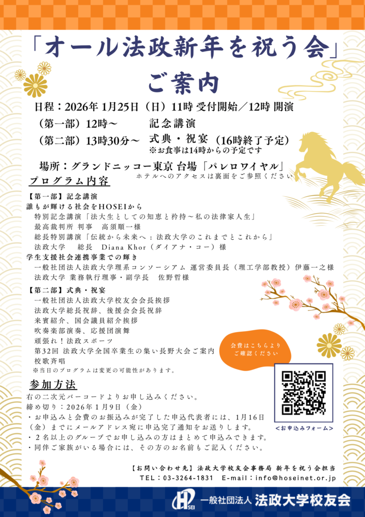 2026年も「オール法政新年を祝う会」を下記のとおり開催いたします。 母校の旗の下、校友同士の交流を深め、新しい繋がりを育む貴重な場です。