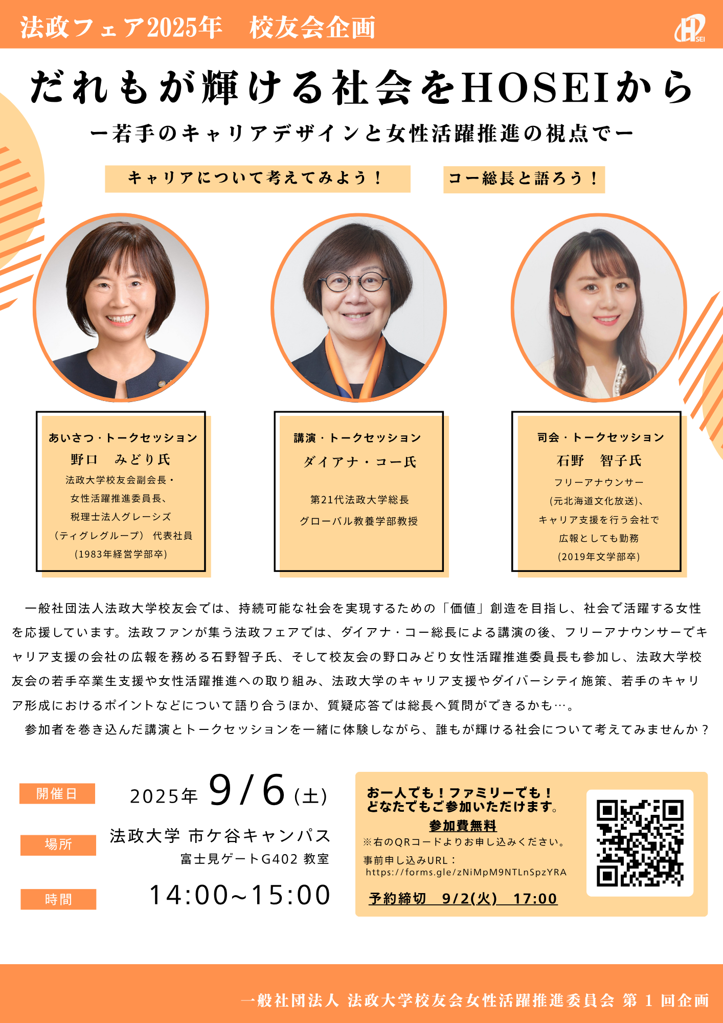 ①講演会企画 だれもが輝ける社会をHOSEIからー若手のキャリアデザインと女性活躍推進の視点でー