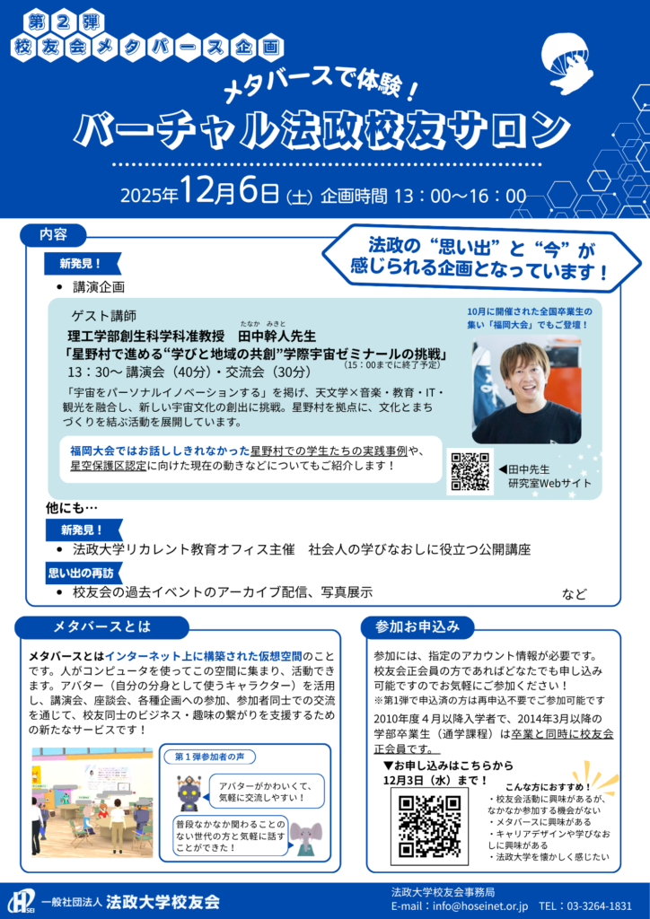 ゲスト講師として理工学部創生科学科准教授の田中幹人先生をお迎えし、メタバース空間を活用した講演会・交流会を開催します。