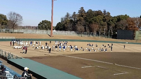 12月7日(日)、晴天の千葉県野田市総合公園野球場において、22回目となる「令和7年度野田市少年野球教室」が開催され、法大野球部員30余名が来場し、約20チームの小中学生に野球指導を行いました。